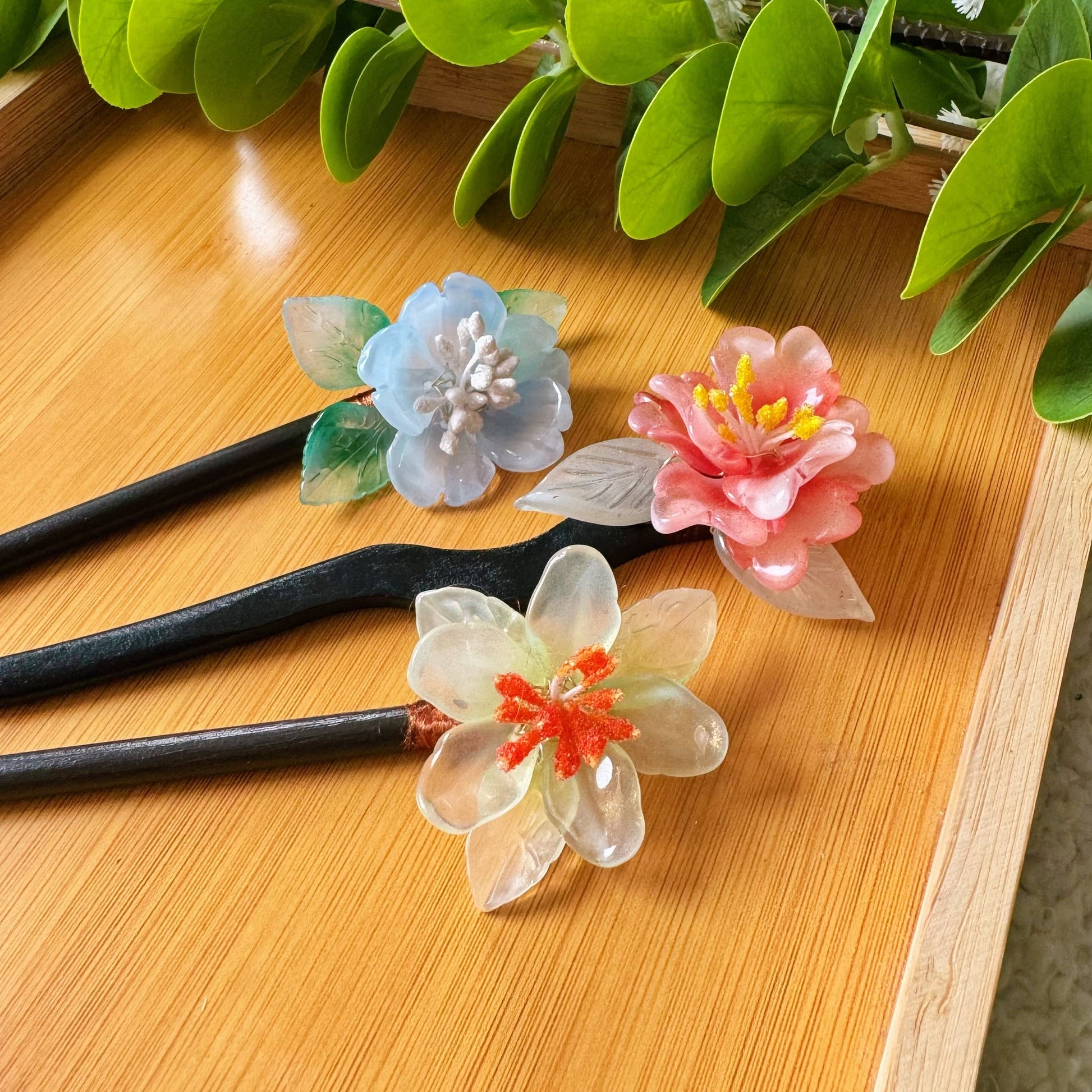 Triple the Elegance: A curated set of three matching pins featuring soft floral embellishments on polished wooden sticks, offering maximum creative freedom for intricate hairstyles.