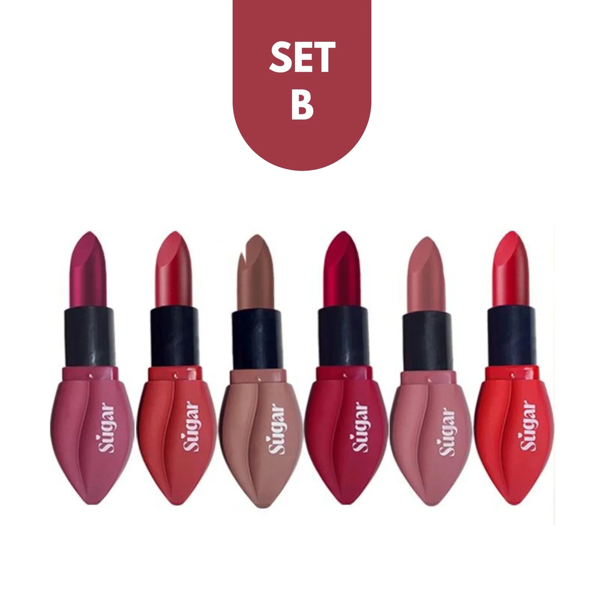 Indulge your lips with the Sugar Matte Lipstick Collection – a vibrant, long-lasting range of fashionable shades perfect for every mood and moment. Packaged in adorable kiss-shaped tubes, these matte lipsticks offer rich pigmentation, a smooth glide, and an ultra-lightweight feel that lasts up to 24 hours. From bold reds to subtle nudes, express yourself with colour that stays flawless all day.